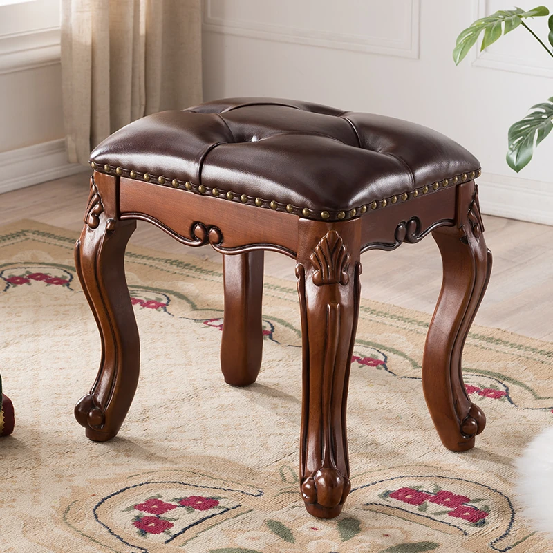 アメリカンスタイルの無垢材化粧台ベンチ - 高級本革張り、寝室にぴったりな彫刻デザインのメイクアップスツール。美しさを引き立てるアイテム、小さめサイズで使いやすい!