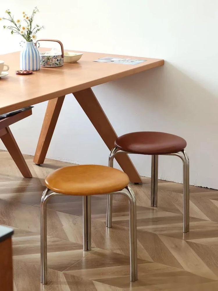 シンプルなステンレス製ラウンドスツール|北欧風・スタッキング可能|リビングやダイニングに最適!玄関や靴を履く場所にもぴったりの金属製スツール。デザイン性と機能性を兼ね備えたアイテムです。