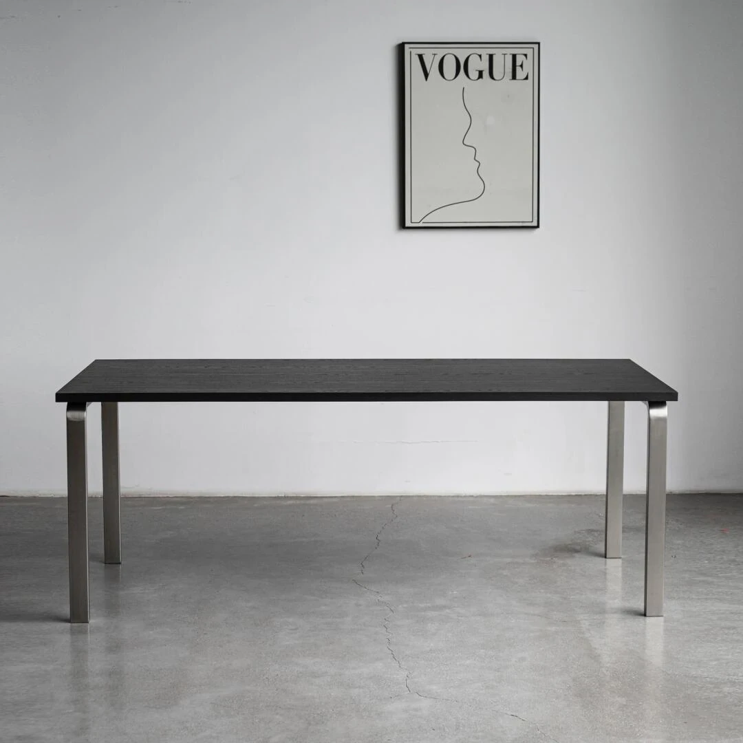 侘寂スタイルの無垢材ビンテージデスク - 中古ステンレススチールブラックワークテーブル、長方形のマスターデザインで、独特な風合いと温もりを兼ね備えた一品。あなたのスペースをより魅力的に演出します!
